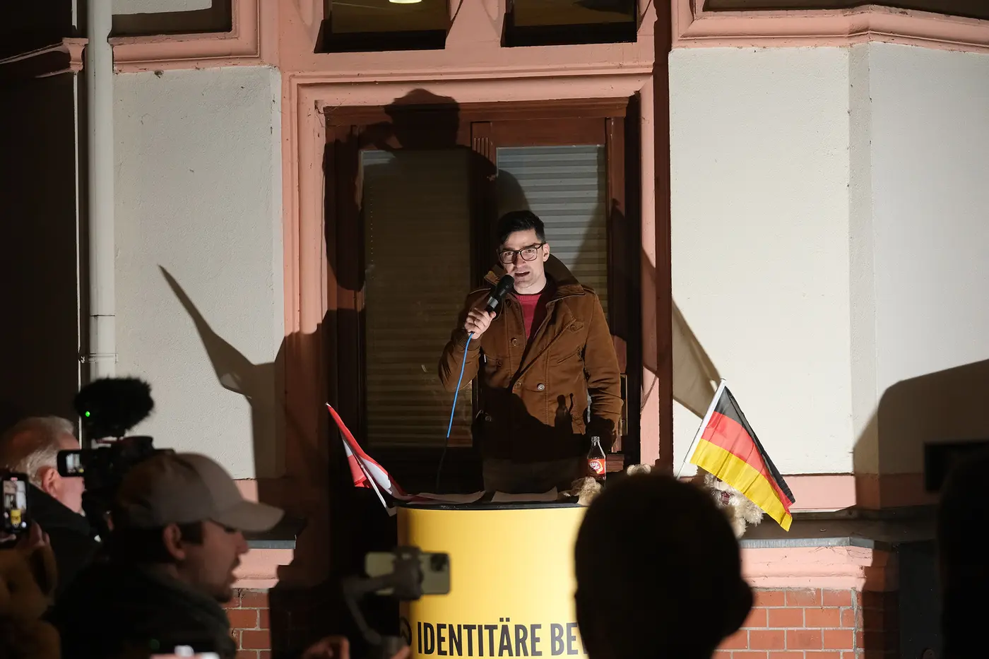 Martin Sellner, rechtse activist uit Oostenrijk, spreekt op een bijeenkomst van de identitaire beweging.